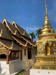 Wihan Lai Kham is the architectural star of the complex — a true Lanna masterpiece with intricate gilded woodwork, red lacquer interiors, and historic frescoes showing scenes of traditional Northern Thai village life. These 1800s murals are among the finest surviving examples of Lanna artistry.