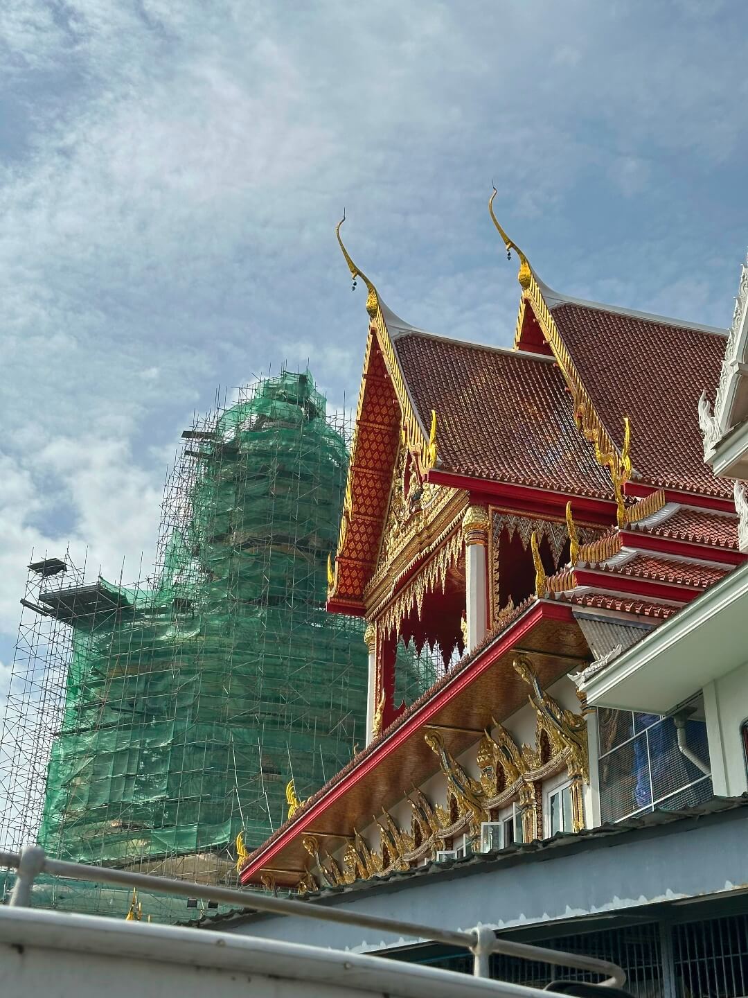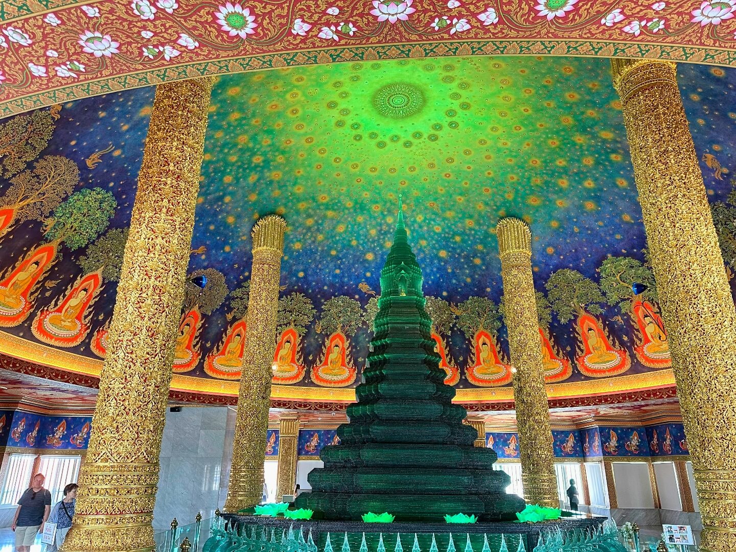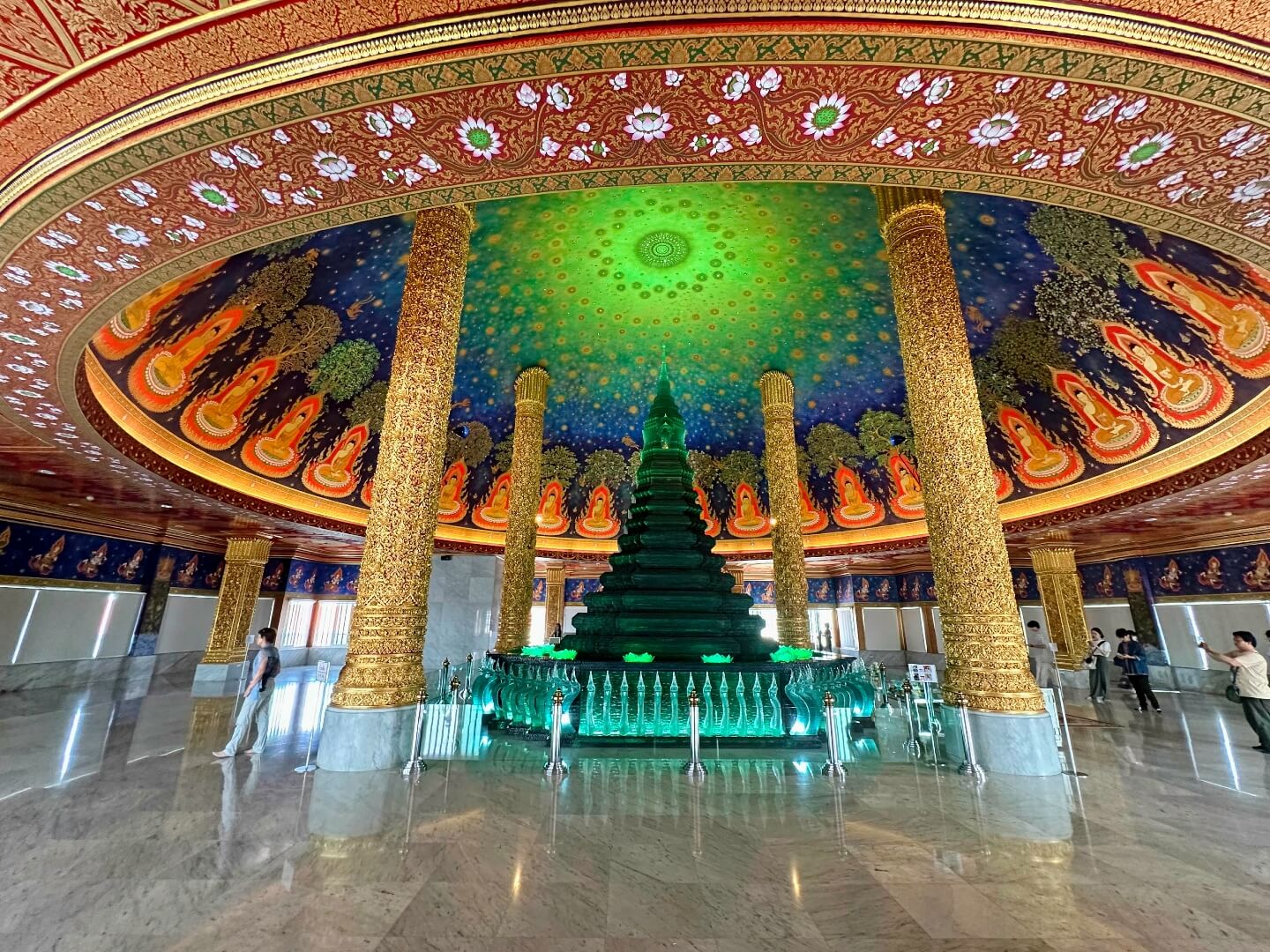 Unfortunately, the Buddha was shrouded in scaffolding getting some last minute remediation. But we did get to enjoy the stupa named “Maharatchamongkhon”. The 80 meters (260 ft) high stupa has a twelve-sided polygon shape with five floors in it, including another 8-meter glass stupa. The stupa was finished in 2012, costing a total of 500 million baht. The dome ceiling at the top floor is spectacular.