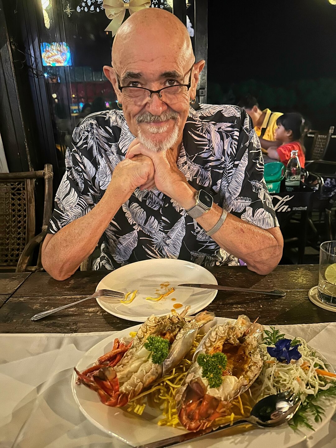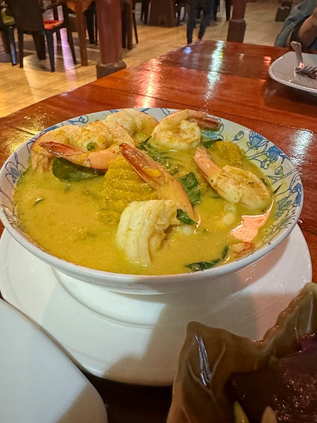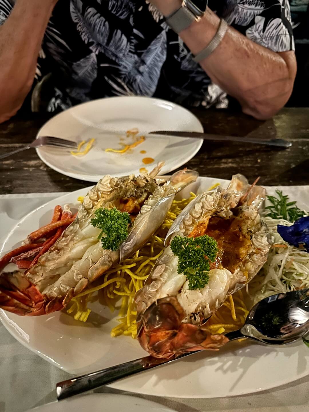 The River Restaurant and Bar is Arm’s (Mr Chung’s son) super successful floating restaurant in Krabi’s town centre. We had a meeting with him about handing over the website for him to manage going forward. With The River being number 1 in Krabi, it’s always packed for dinner. After the meeting, we enjoyed a great meal, then just as we were ready to depart, Arm said he had some special river prawns for us. Oh no – we’re stuffed, and now he’s delivered 2 river prawns all decked out on a huge platter. They were enormous. The tails were the size of bananas. Ok, so now we are over-stuffed.