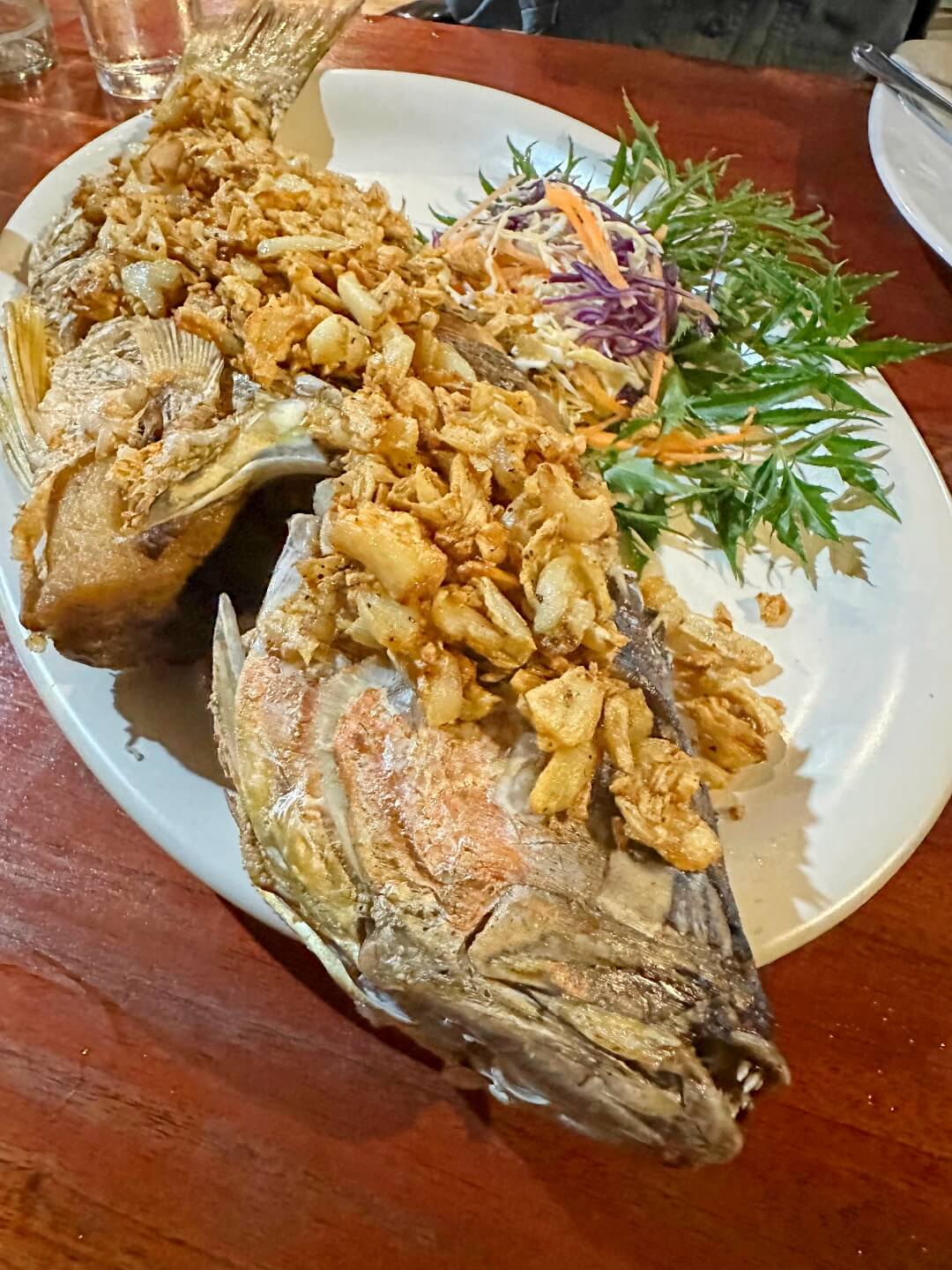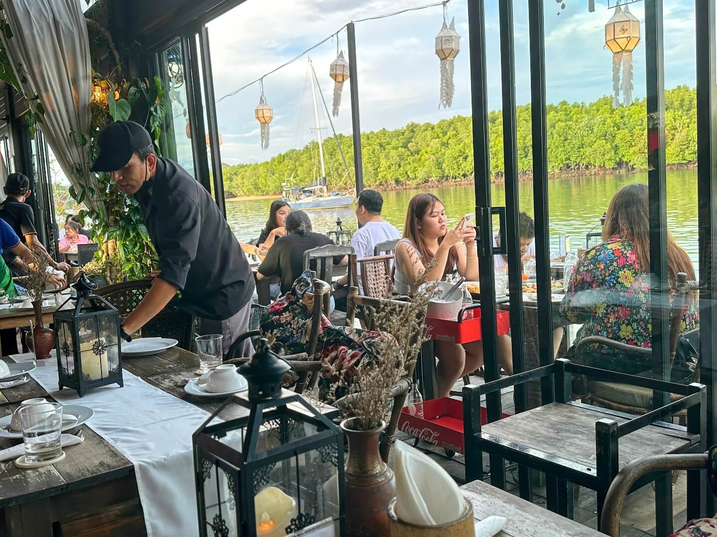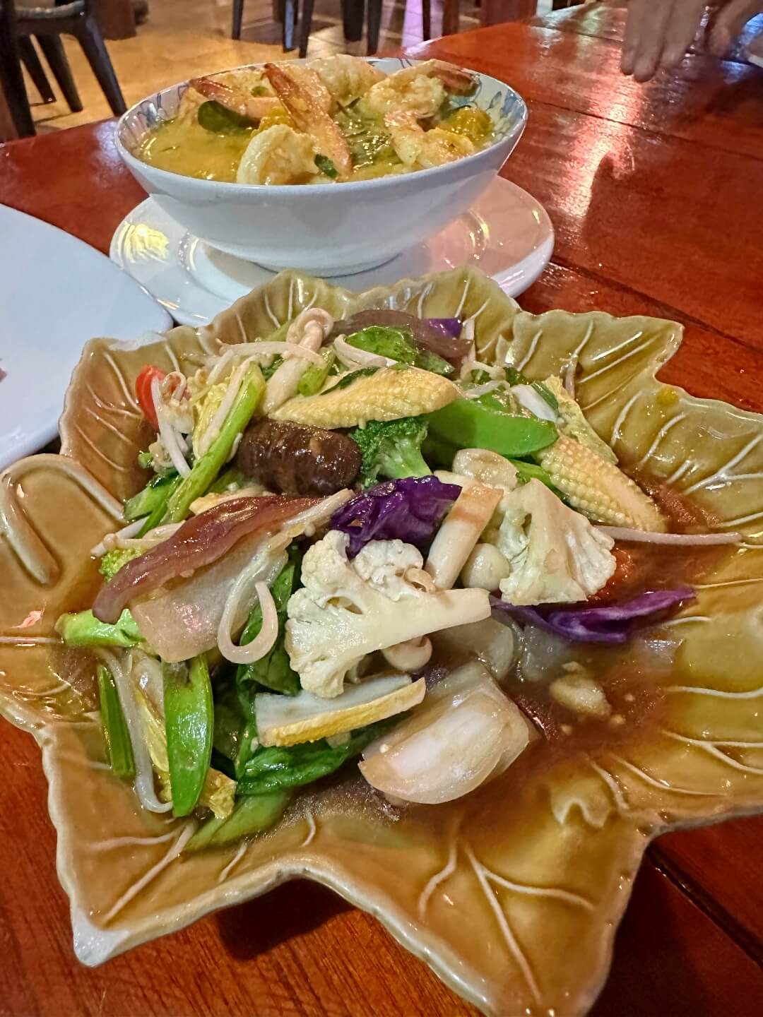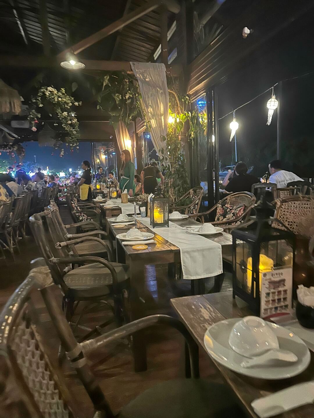 The River Restaurant and Bar is Arm’s (Mr Chung’s son) super successful floating restaurant in Krabi’s town centre. We had a meeting with him about handing over the website for him to manage going forward. With The River being number 1 in Krabi, it’s always packed for dinner. After the meeting, we enjoyed a great meal, then just as we were ready to depart, Arm said he had some special river prawns for us. Oh no – we’re stuffed, and now he’s delivered 2 river prawns all decked out on a huge platter. They were enormous. The tails were the size of bananas. Ok, so now we are over-stuffed.