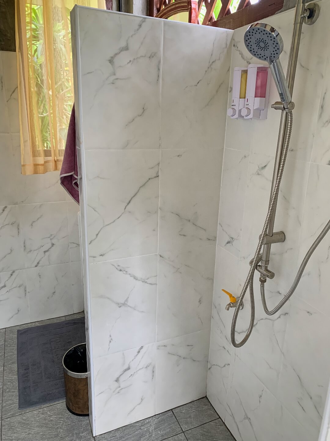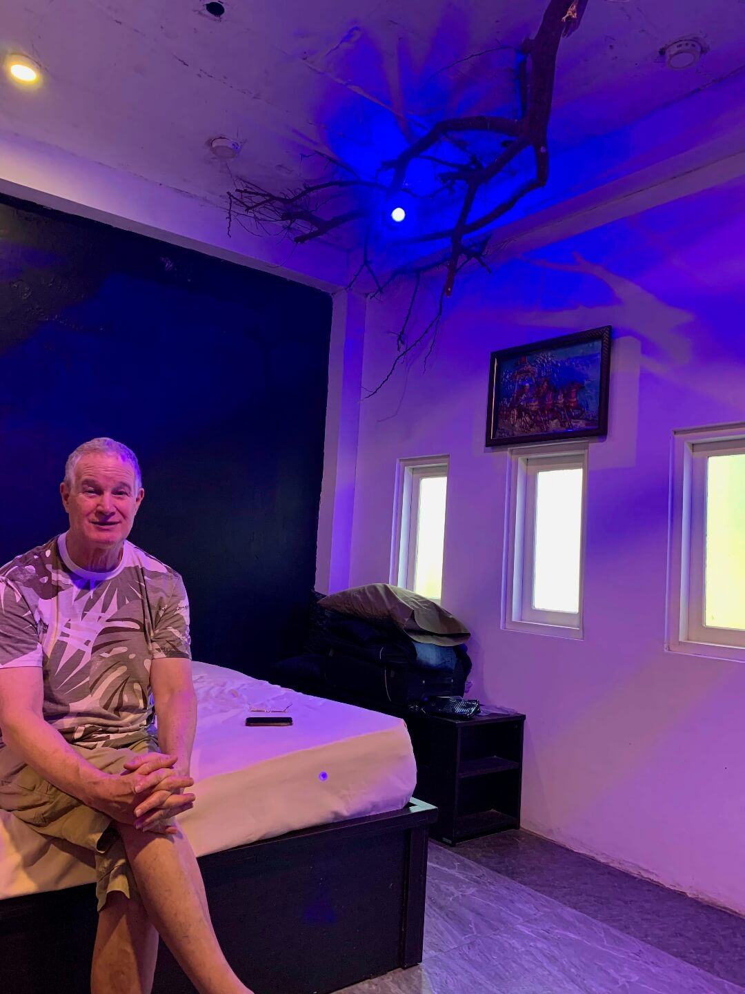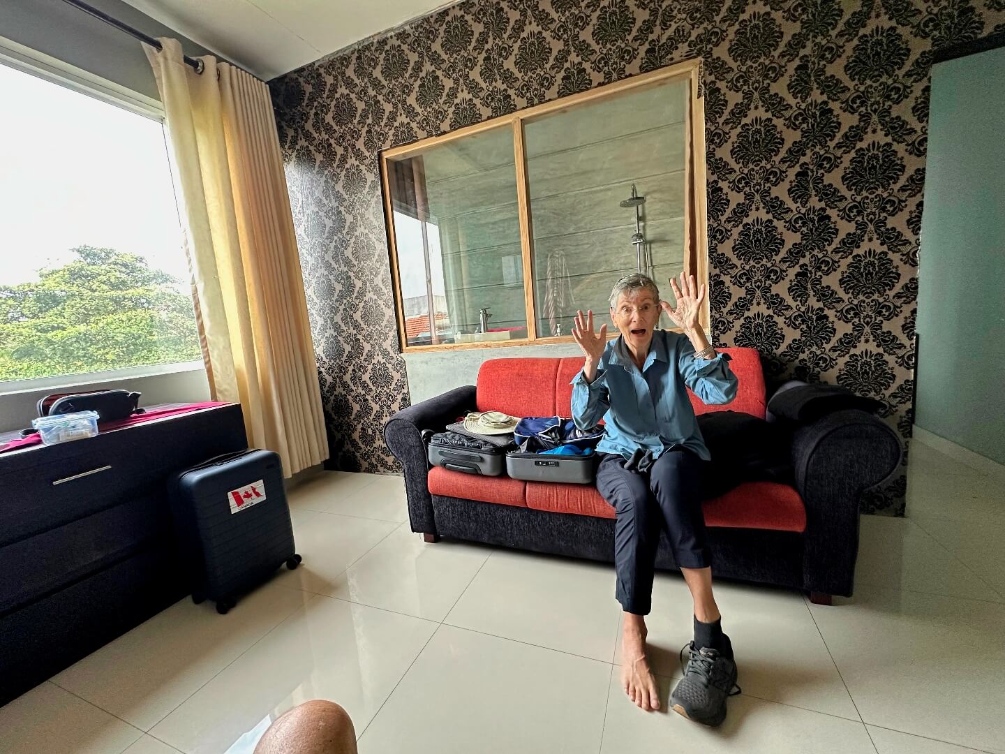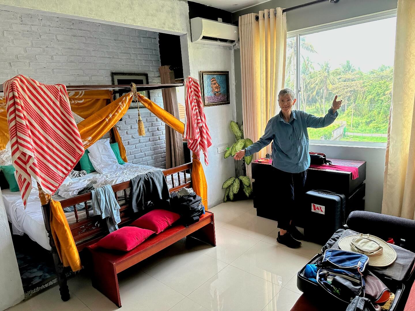 We arrived at 2 a.m. First impressions? Hmm. After winding our way down a long, dark, narrow lane, we hit a dead end. Apparently, we were had arrived. Our driver grabbed the roller bags and headed into the dimly lit property. We followed him up a tight stairway—two flights—onto a mezzanine-like space with a saggy old sofa and black-painted walls. Just one visible doorway and a hallway barely lit. With some hesitation, we headed down it, and—yes, a door! Inside was a jumbled room. Turning on the lights didn’t help much. A large four-poster bed was wedged tightly into an alcove—only accessible if you sucked in and slid sideways. Off to one side, a bathroom. Step down over a curb into a tiled shower tray, then up again to reach the sink and toilet. No mirror. No towel rack. We looked around thinking, *where are we?* This definitely didn’t show up in the photos. Too tired to care, we crashed.