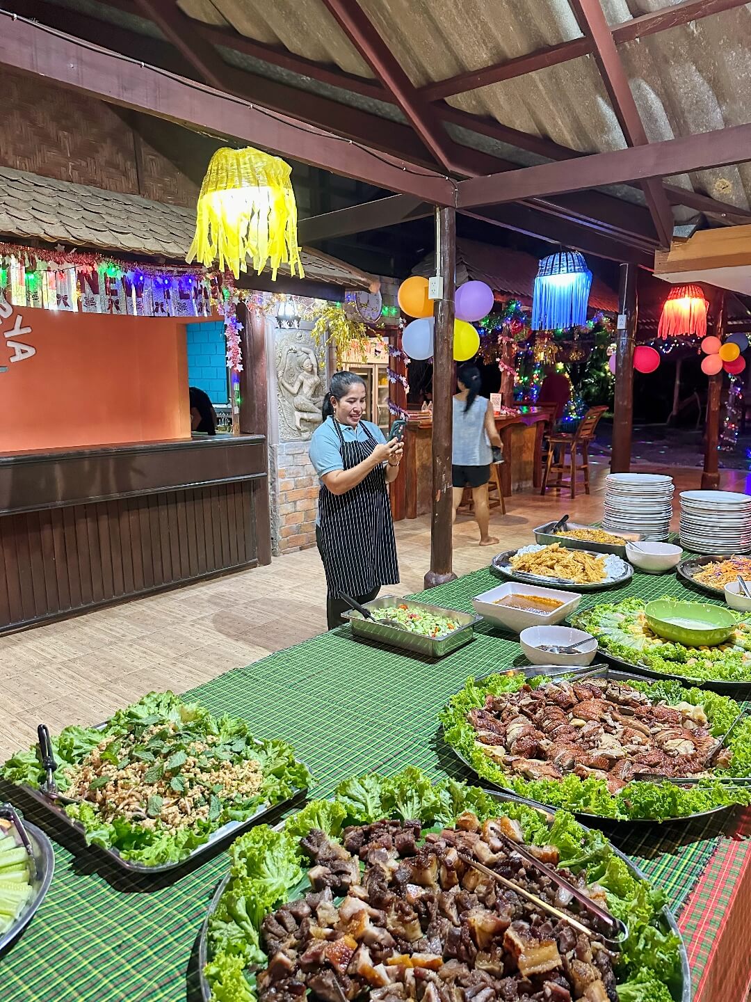 This year, the famous New Year buffet feast made its grand return. 🎉 Chung and Kaew revived the beloved tradition, complete with Trang-style BBQ pork, BBQ duck, haw mok (spicy fish curry), endless skewers of chicken satay with rich peanut sauce, an abundance of tropical fruit, and, of course, mango with sticky rice to top it all off. Wow.