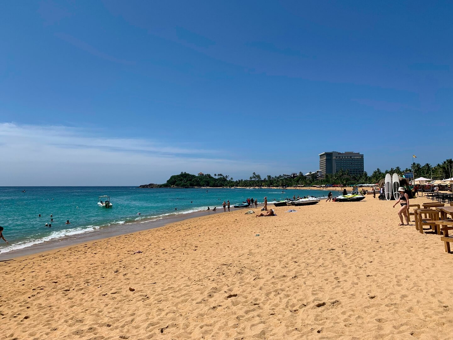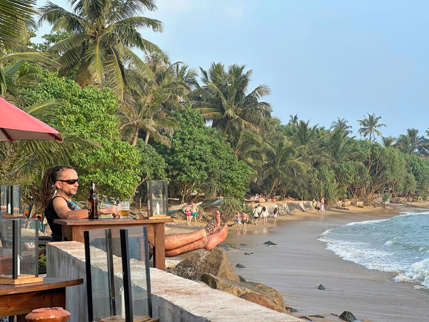 One afternoon, we ventured 8 km over to Unawatuna, a lively beach town. We grabbed a table under a marquee at one of the many beachfront spots and enjoyed a cold beer while watching the scene. The arcing sandy beach was packed with sun-seeking European retirees. Fun for a quick visit—but a little too touristy for our taste.