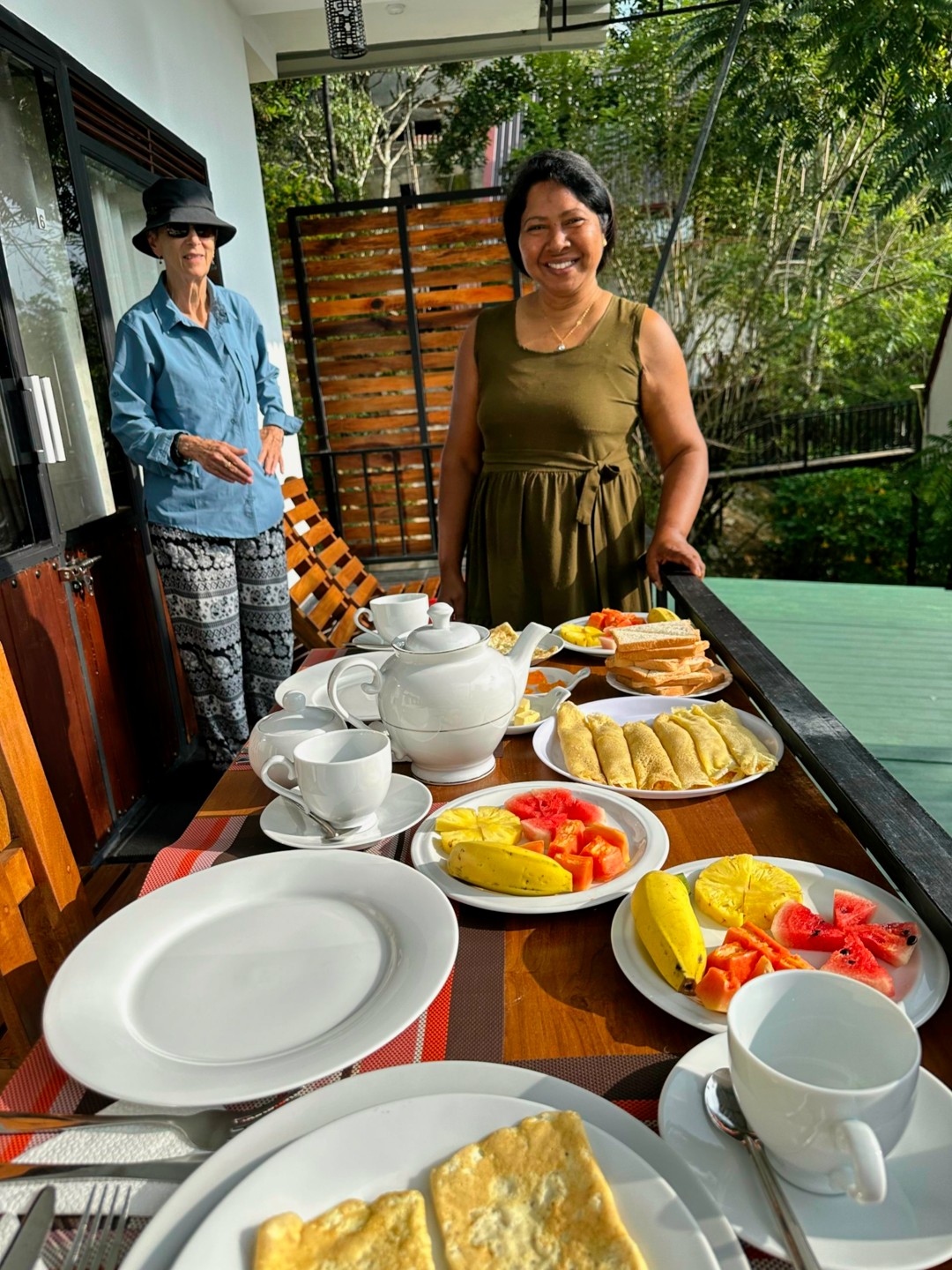 Next morning… the big window looked out over an overgrown, vacant pasture. So this was the “Garden View”? We headed down to the canal-side patio for our included breakfast. It was plentiful—very Sri Lankan—heavy on the carbs: assorted breads, crepes, and fresh tropical fruit. More than we could manage.