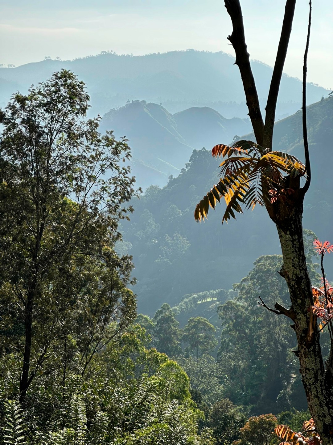 After four nights in Mirissa, we headed inland—175 km and 1,000 m up—to the misty hills of Ella. Known for its rich biodiversity, the Ella region is surrounded by lush cloud forests and endless tea plantations. Thanks to its elevation, the climate here is much cooler than the coast—around 18ºC. The Ella Gap famously offers sweeping views across the southern plains, and on a clear day, you can even glimpse the Indian Ocean.